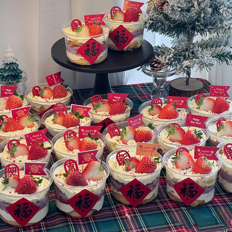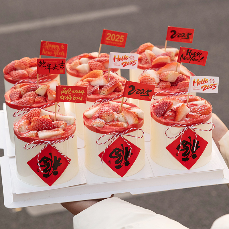 2025年の新年のデザートのムースは碗のケーキの装飾のシールの福の字の吉祥の如意を包んで年を越えて小さい旗のプラグインを挿します。