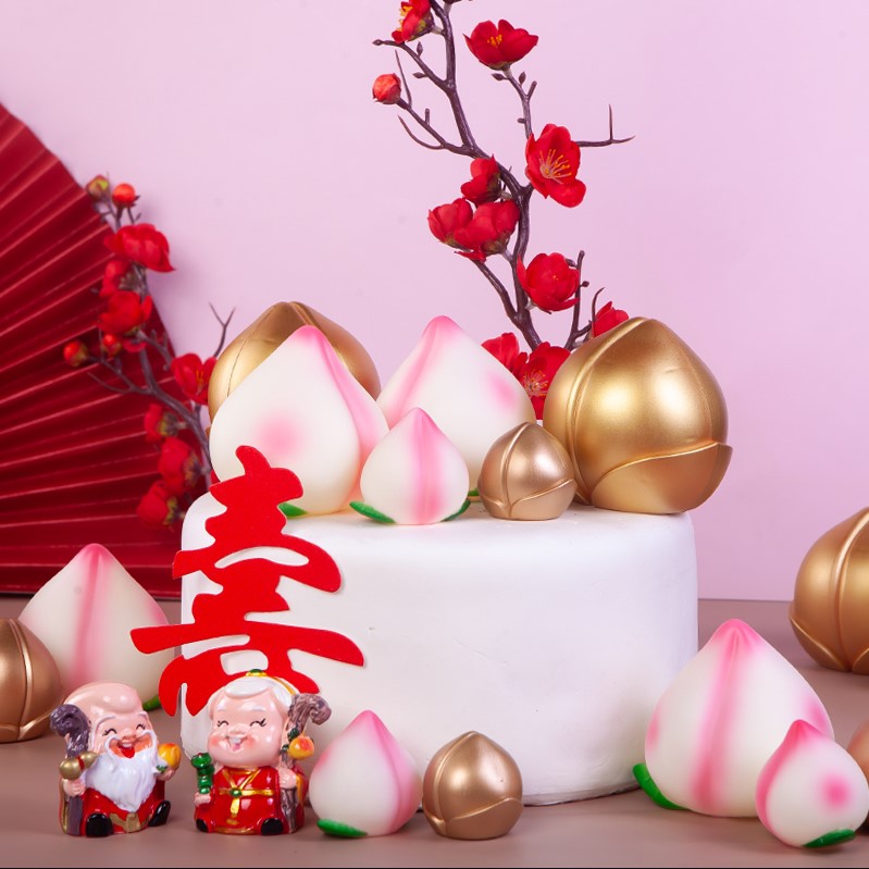 10個の寿桃の誕生日ケーキの装飾品ピンクの金色の扇子寿公寿婆寿星用品