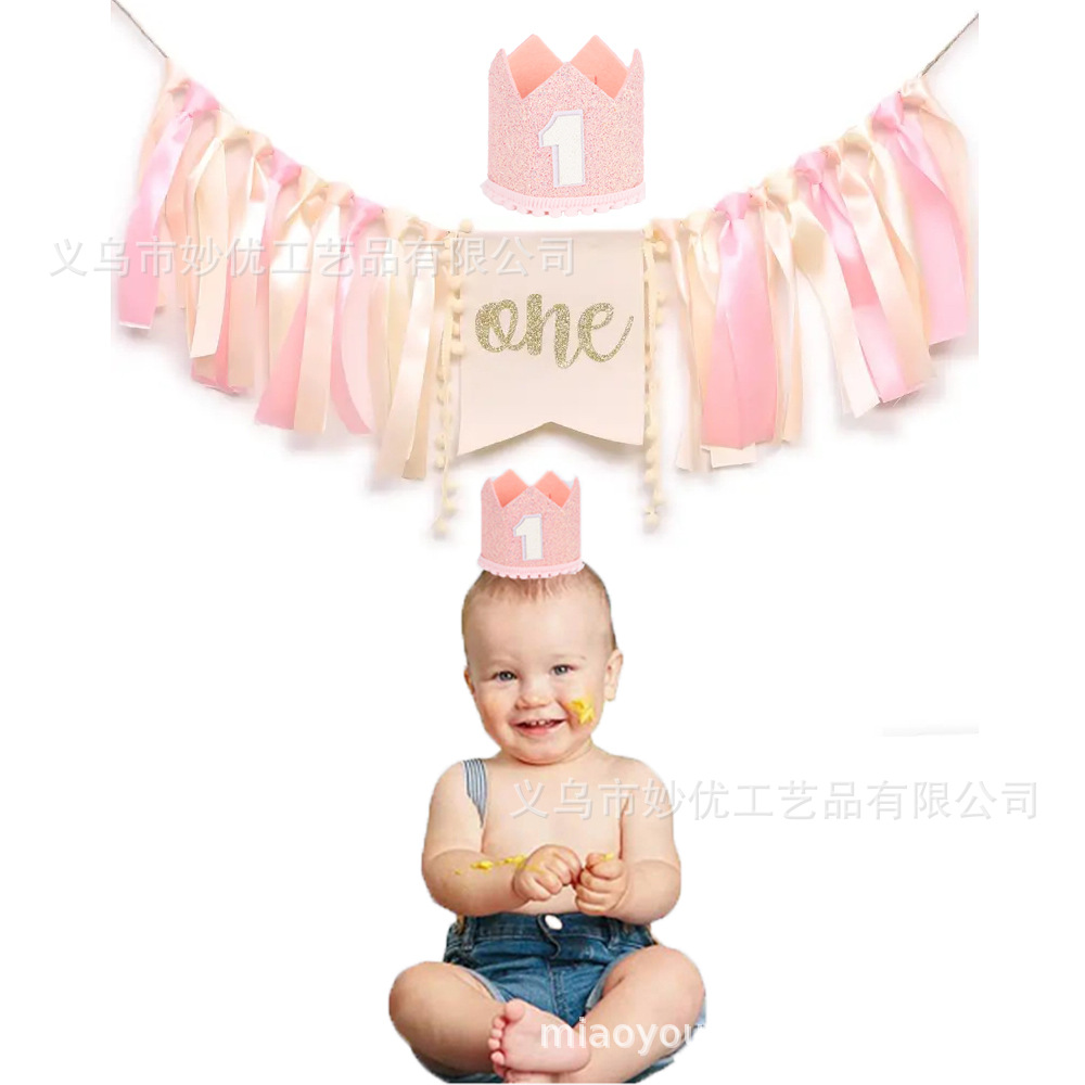 国境を越えたアンドロメダの誕生日に旗を引くピンクのフリンジの高い椅子の誕生日に旗を引く赤ちゃんのテーブルと椅子の王冠の帽子
