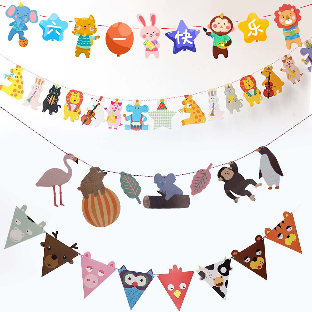 誕生日は旗を引いて子供の日の幼稚園の活動を飾って漫画の小動物を飾って旗を引いて誕生日の集まりを飾って色の旗を飾ります。