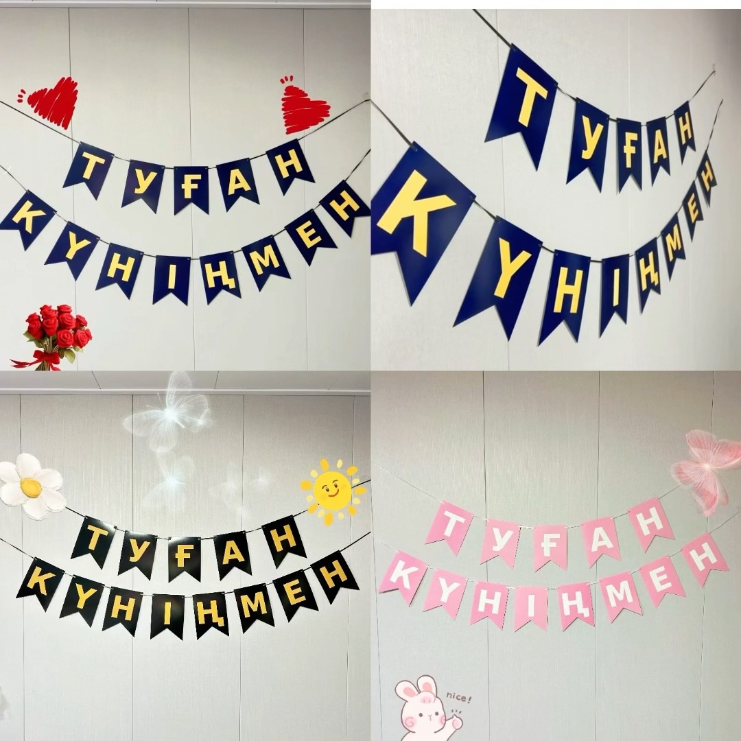 ロシア語の燕尾旗、カザフスタンの祝福の言葉、シーンの装飾、横長の旗、紙製の旗、卸売、誕生日パーティー