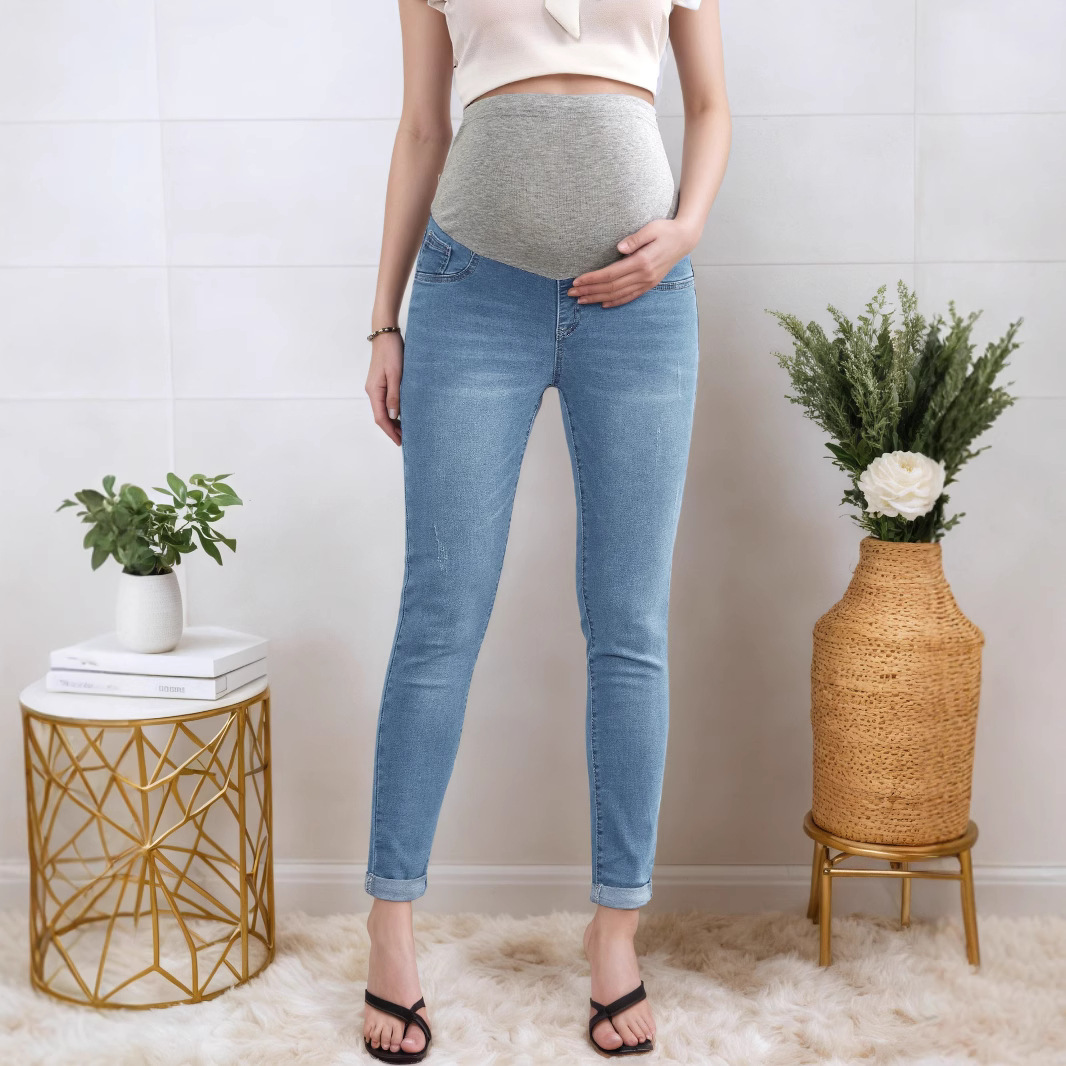妊婦のデニムのズボンの外は水色と小足の鉛筆を着てズボンを打ちます。