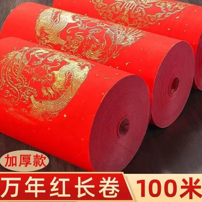 万年紅宣紙ロール状対聯用紙、厚手、春節専用、大紅金箔龍鳳模様入り、白紙、手書き春聯用
