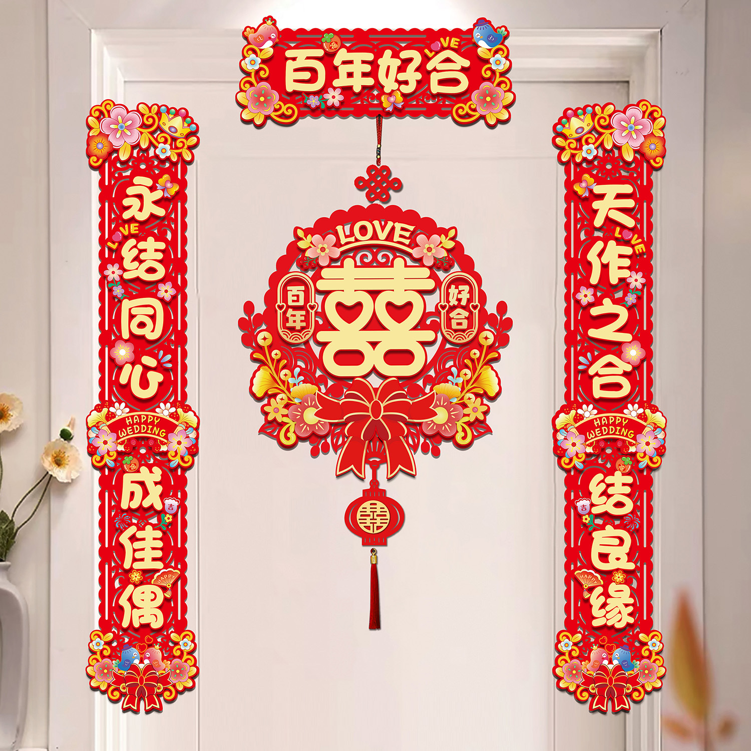 結婚対聯喜字シール結婚式の女性の結婚部屋の装飾はドアの玄関の喜聯セットの結婚用品を配置します。
