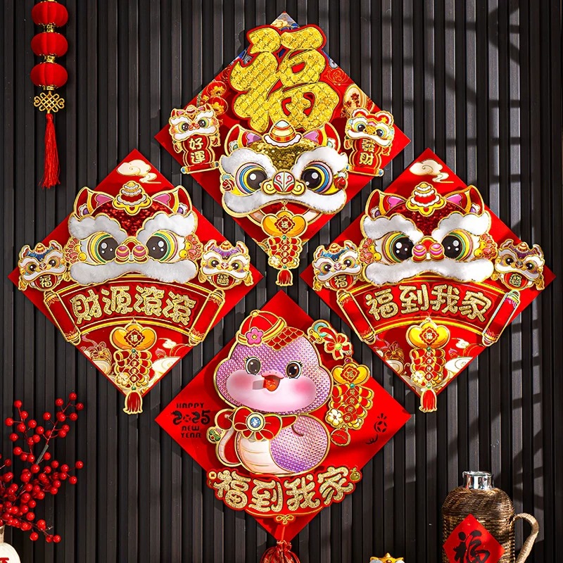 新年の目が覚めた獅子の福の字の2025蛇の年の植毛の立体の闘方の春節の正月の扉はショーウインドーのガラスの家庭用の装飾を貼ります。
