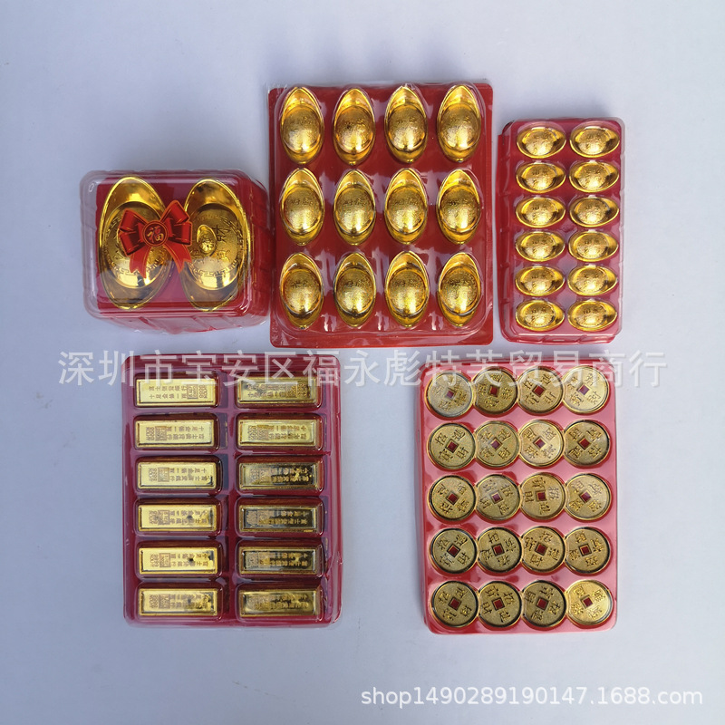 旧正月の装飾用品は金元宝の店舗の開業シーンをシミュレーションしてショーウインドーを配置して新年の大きさの元宝を並べます。