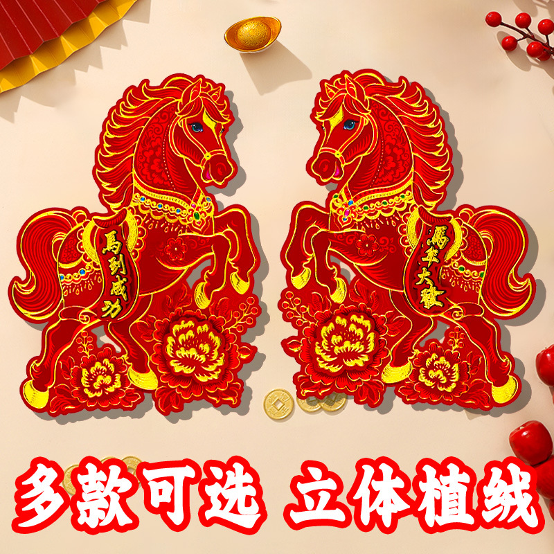 新年装飾用の馬年福字金箔植毛立体ドアステッカー、春節飾り、干支のお祝い、卸売