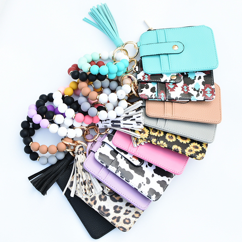 2025年ビーズブレスレット、クロスボーダー女性用プリント小銭入れ、IDカード・銀行カードケース、PUタッセルキーホルダー