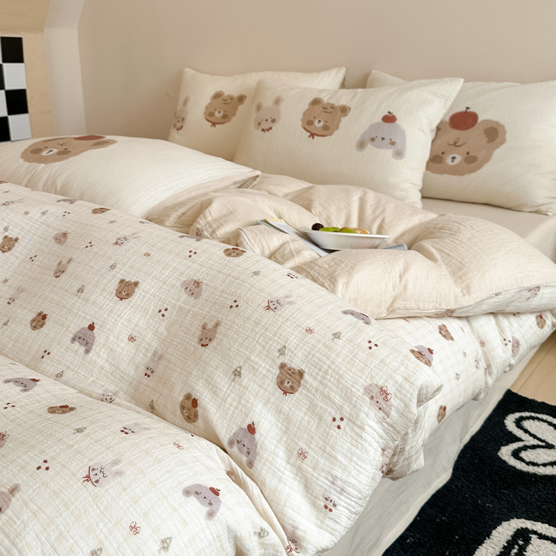 韓国系少女心ロリータ風かわいい熊萌兎タオル刺繍水洗い磨毛シーツカバー4点セット