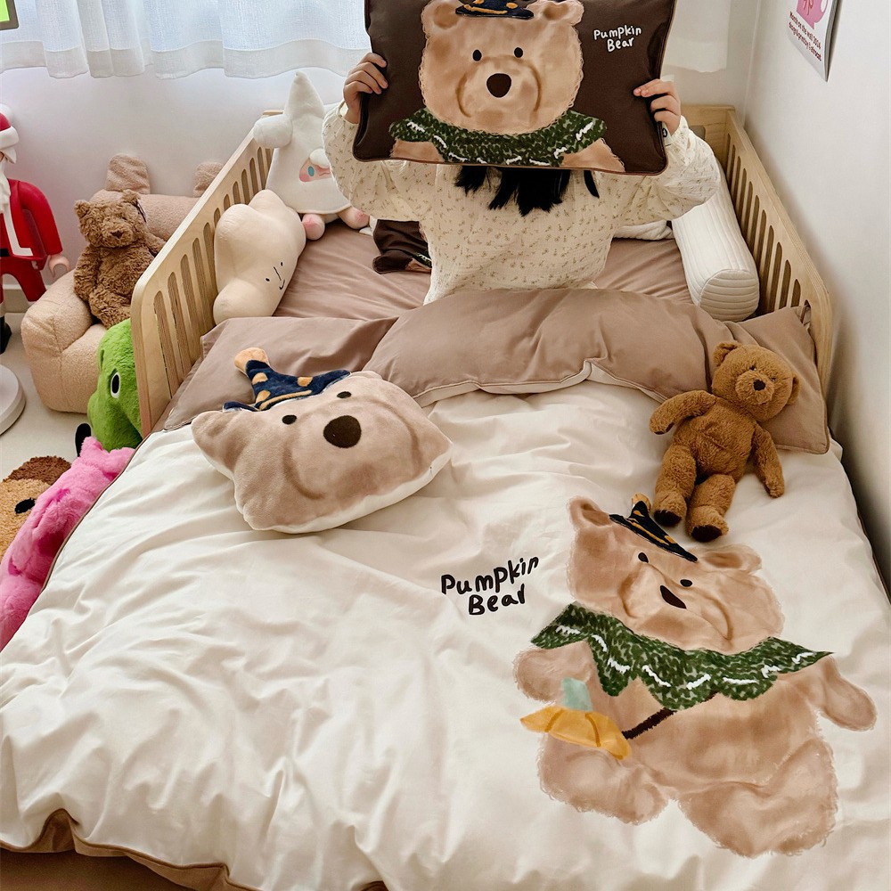 Ins熊刺繍綿100% 水洗い綿4点セット純綿アニメジャカード布団シーツ寝具カバー