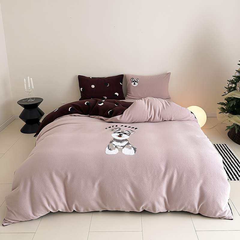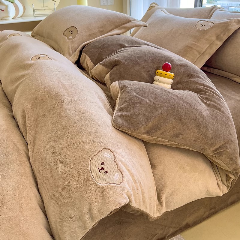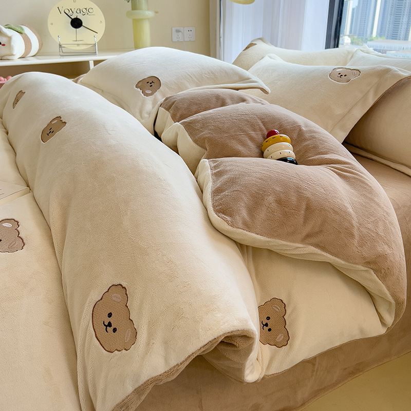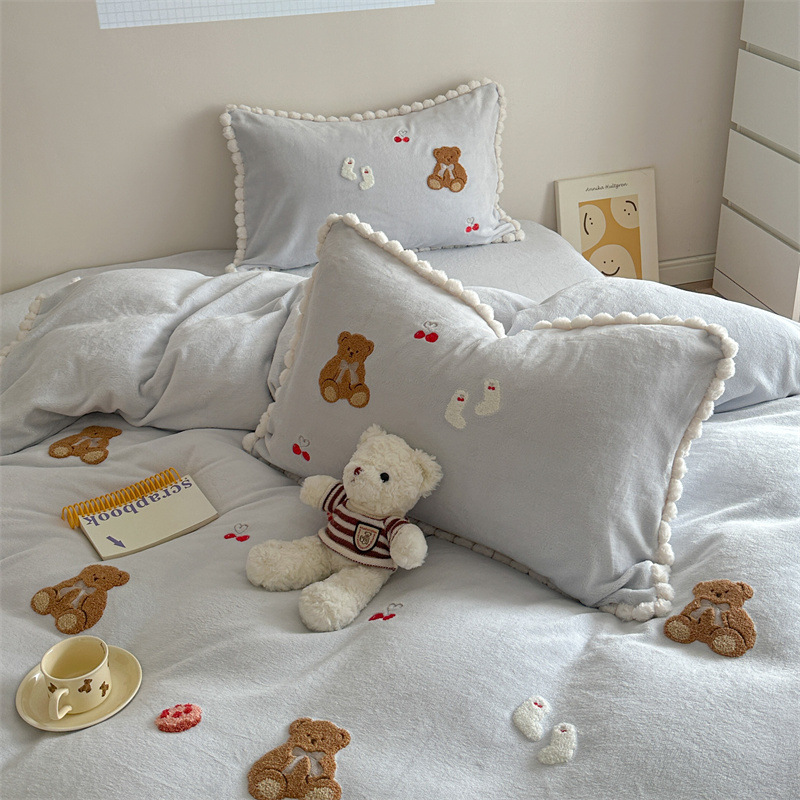 かわいいアニメ風100sベルベット綿綿4点セットベアー刺繍フレッシュ綿布団カバー寝具