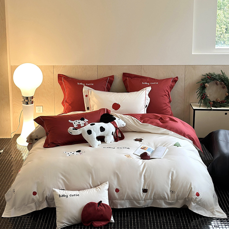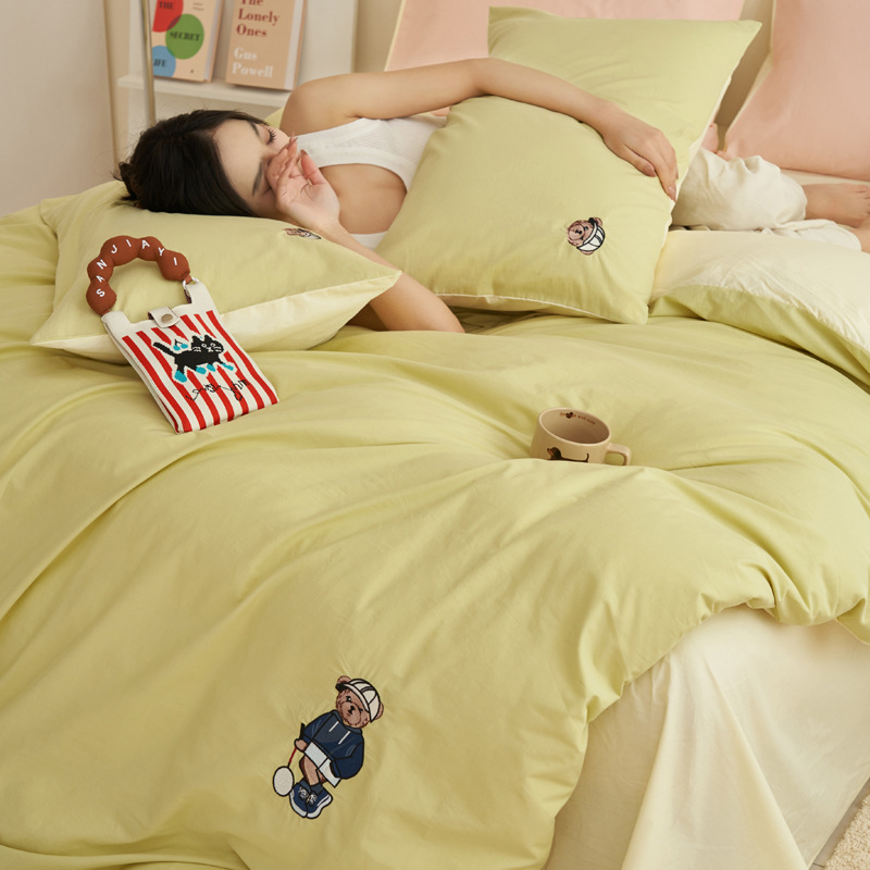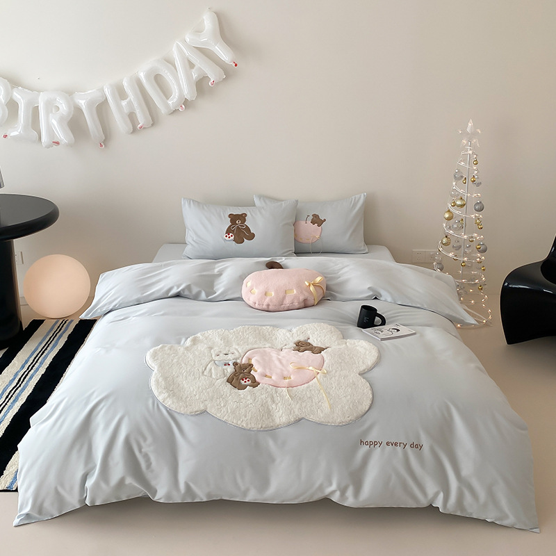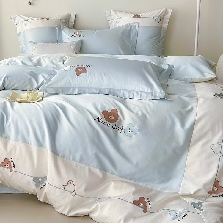 純綿洗濯綿キルティングベッドカバー四点セット熊刺繍40本綿布団カバーダブルベッドシンプル小清新