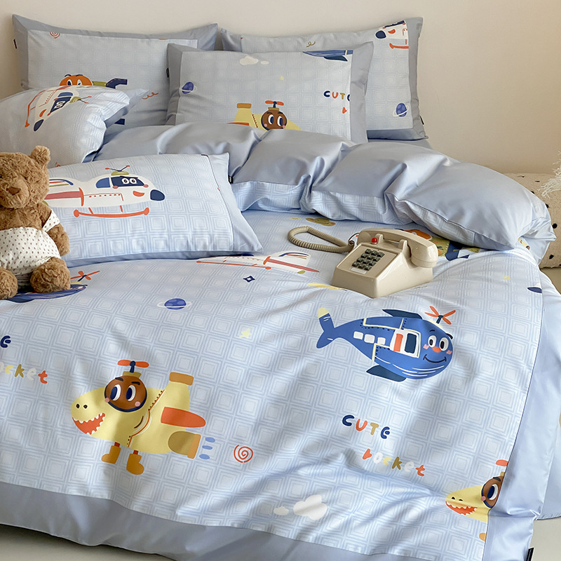 漫画小飛行機綿四セット100純綿寮シーツ少年布団カバー三セット児童ベッド用品1.5