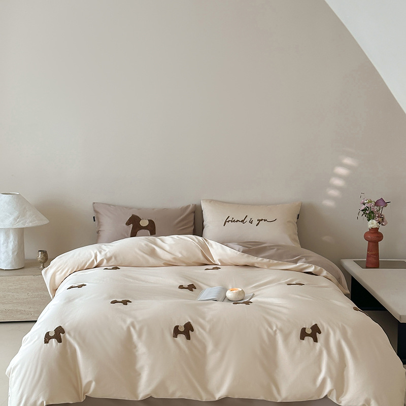 北欧の小清新タオル刺繍綿50本の双股功サテン長パイル綿4点セットの小トロイの木馬刺繍布団カバー