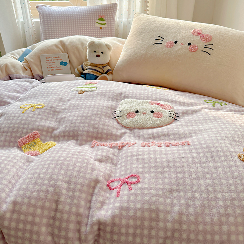 かわいいクリスマスkt猫ミルクベルベットベッド4点セットタオル刺繍布団シーツ笠冬サンゴベルベット3点セット