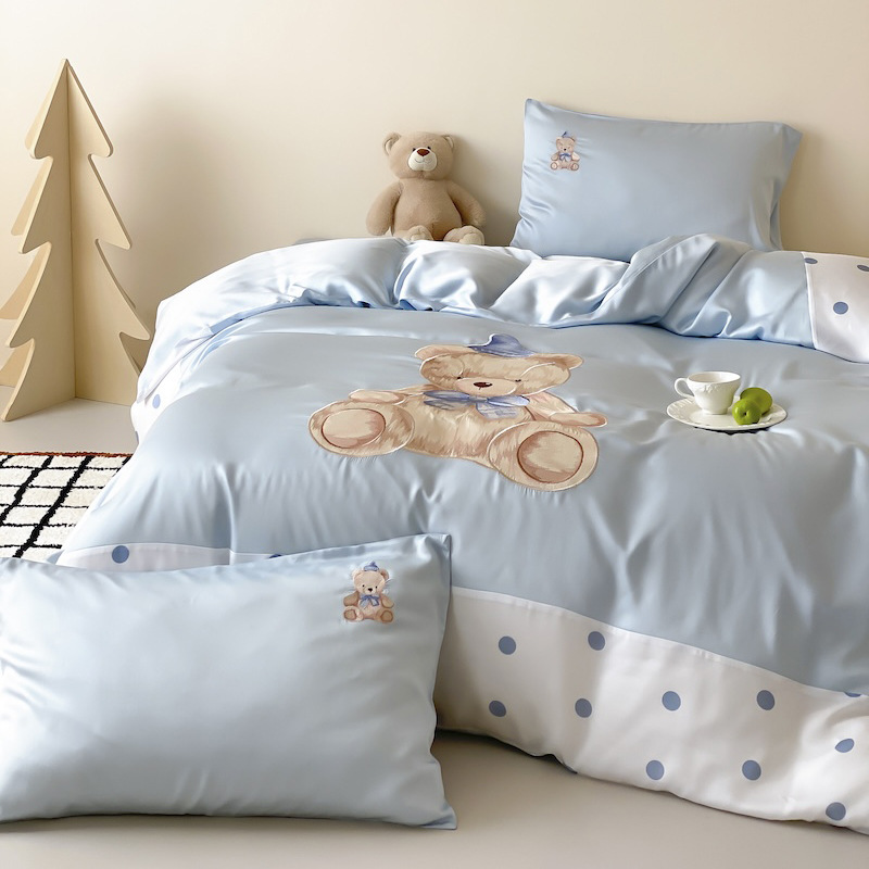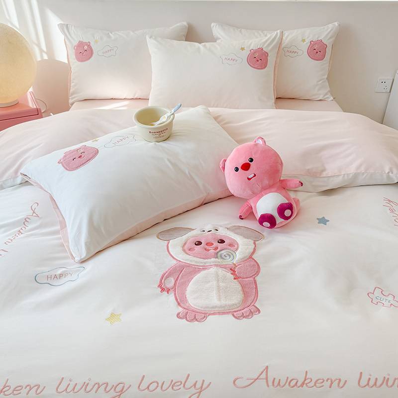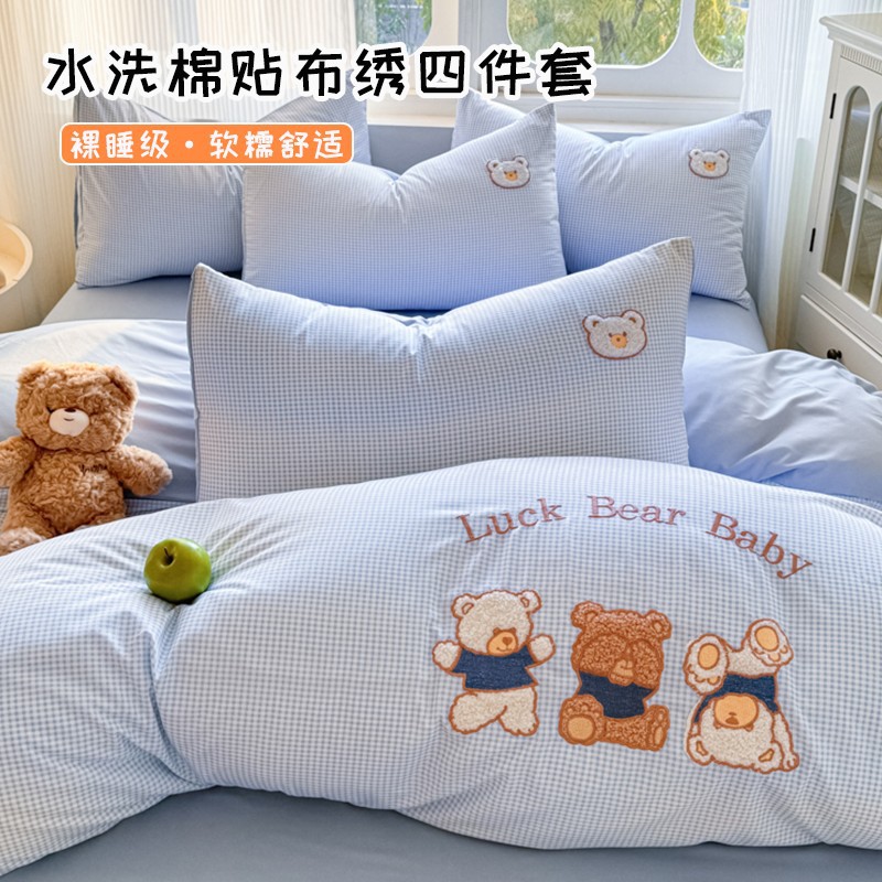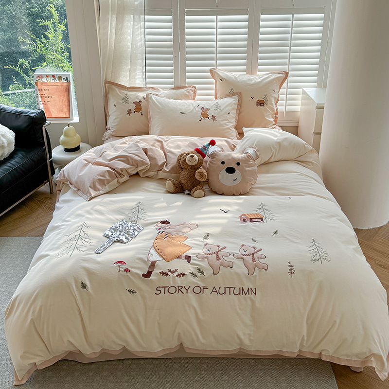 Ins風純綿水洗い綿布刺繍カラーポイント4セット1.5m1.8純綿熊布団カバー毛玉金