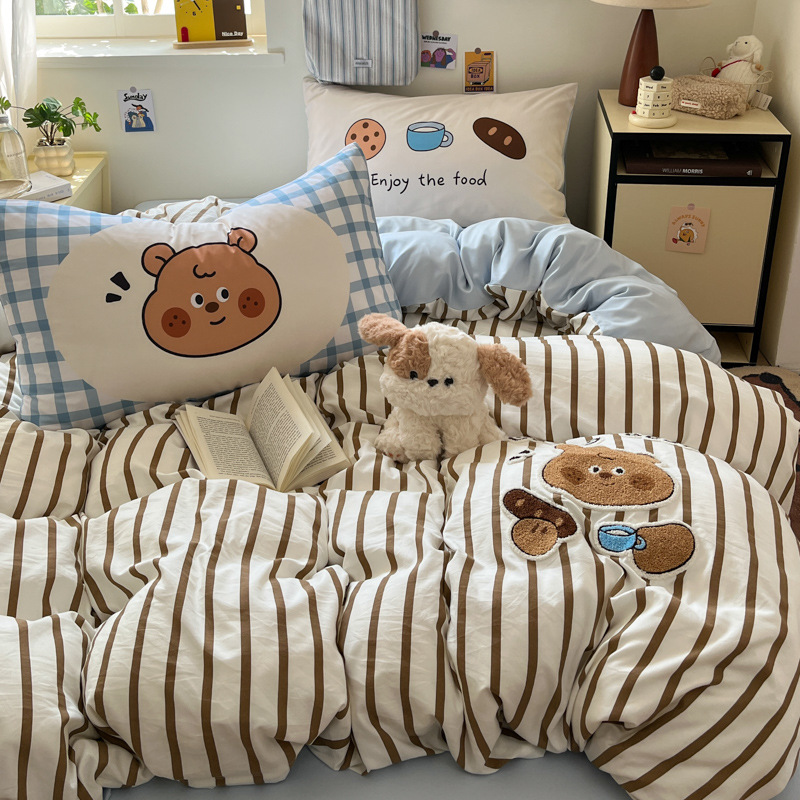 韓系ins少女心かわいいアニメ熊青縞シーツ布団寮三四セット1.5m1.8メートル