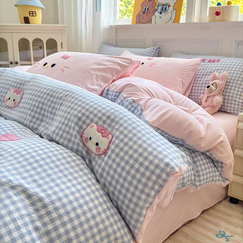 KT 猫漫画刺繍ガールプリンセス風ウォッシュコットン 4 ピースキルトカバーかわいいパッチ刺繍学生寮寝具