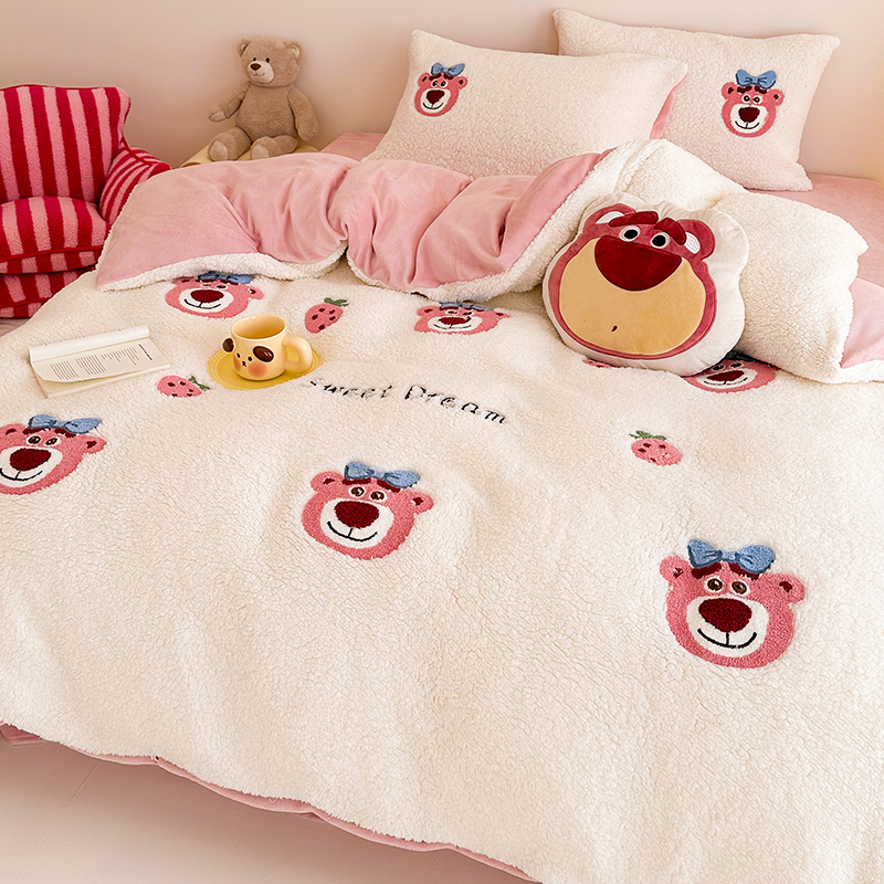 いちご熊はサンゴの牛乳のベルベットを厚くしてベッドの上の4点セットのフランネルのベッドのベルベットのシーツのベッドの笠を厚くした