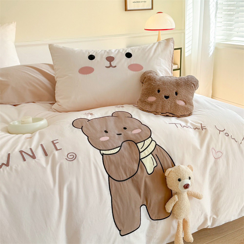 漫画かわいいクマ4ピースコットン洗濯コットン女の子刺繍布団カバーコットンシーツ子供用寝具