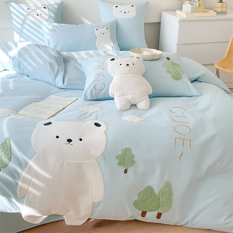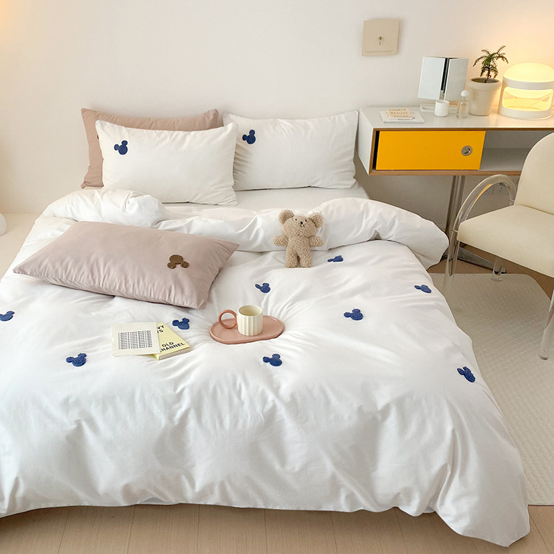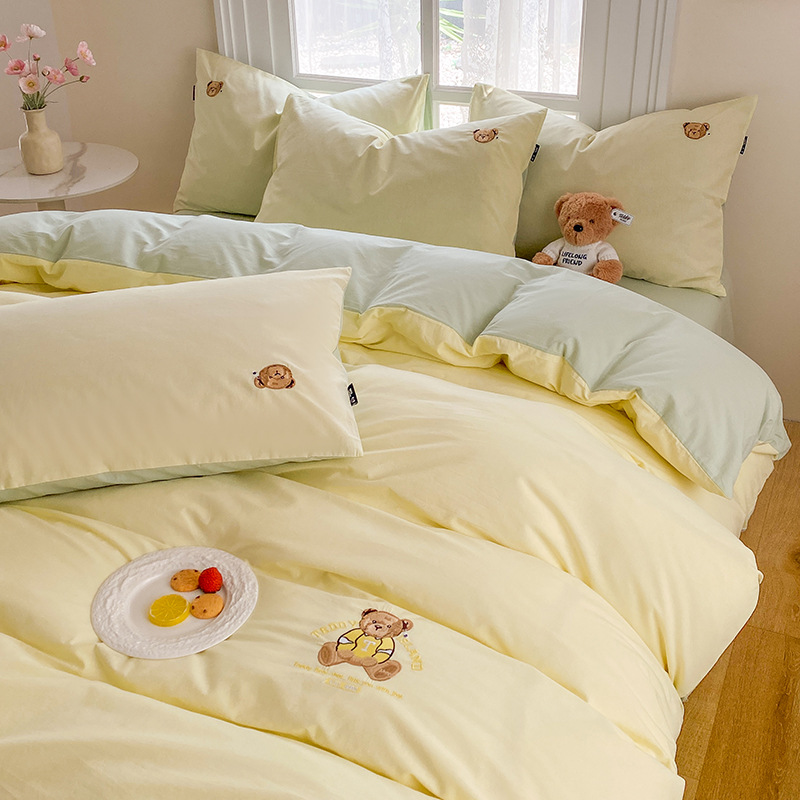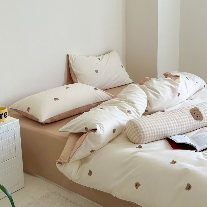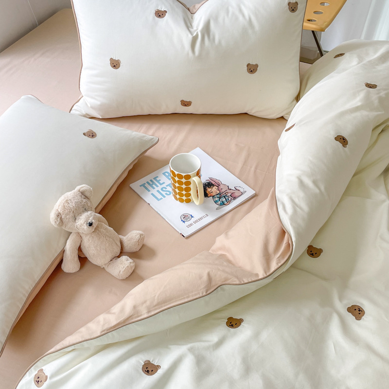 A類綿100% 水洗い綿四季型布団カバーins可愛い刺繍熊シンプル風シーツ小清新四点セット
