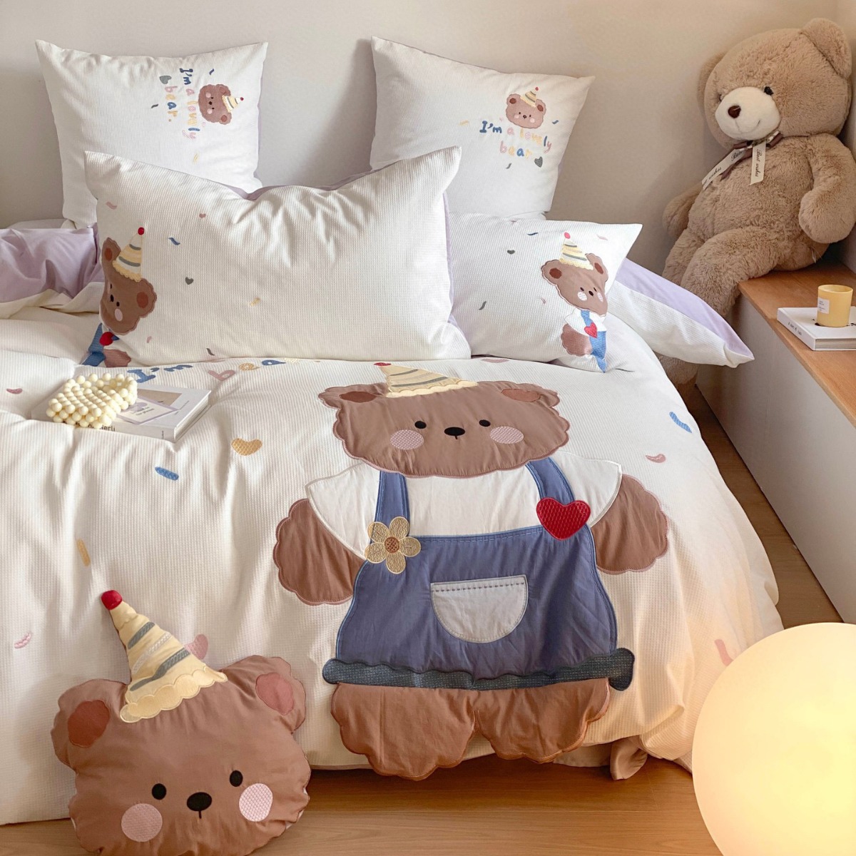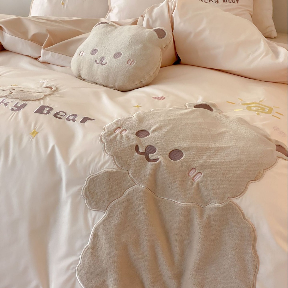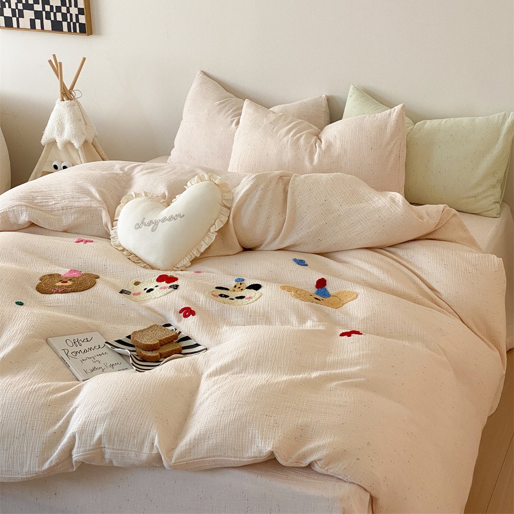 A類綿100% 水洗い綿四季型布団カバーins可愛い刺繍熊シンプル風シーツ小清新四点セット