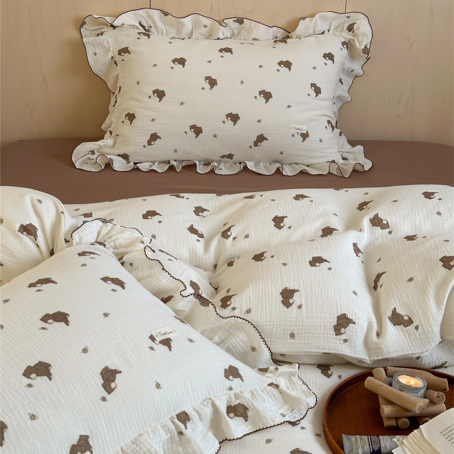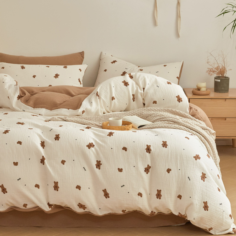 小清新全綿シワ糸四点セットA類快適かわいい熊布団カバー純綿シーツベッドカバーベッド用品
