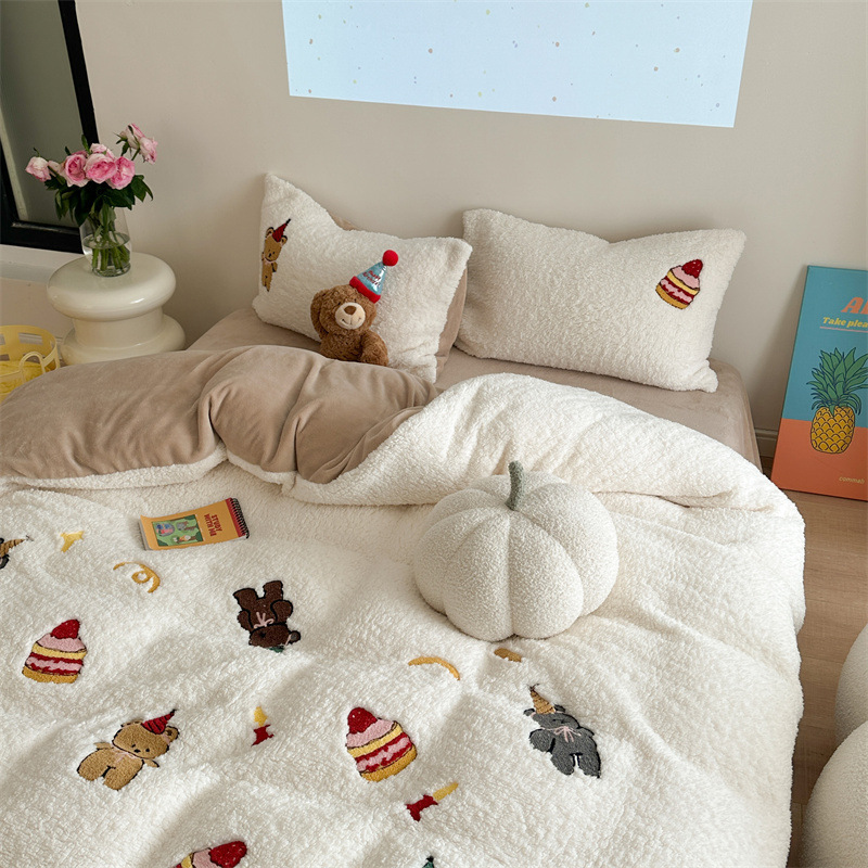 A類の冬は子羊の毛を厚くして、刺繍漫画の熊の牛乳の毛の寝具のサンゴの毛の布団カバーを四つセットします。