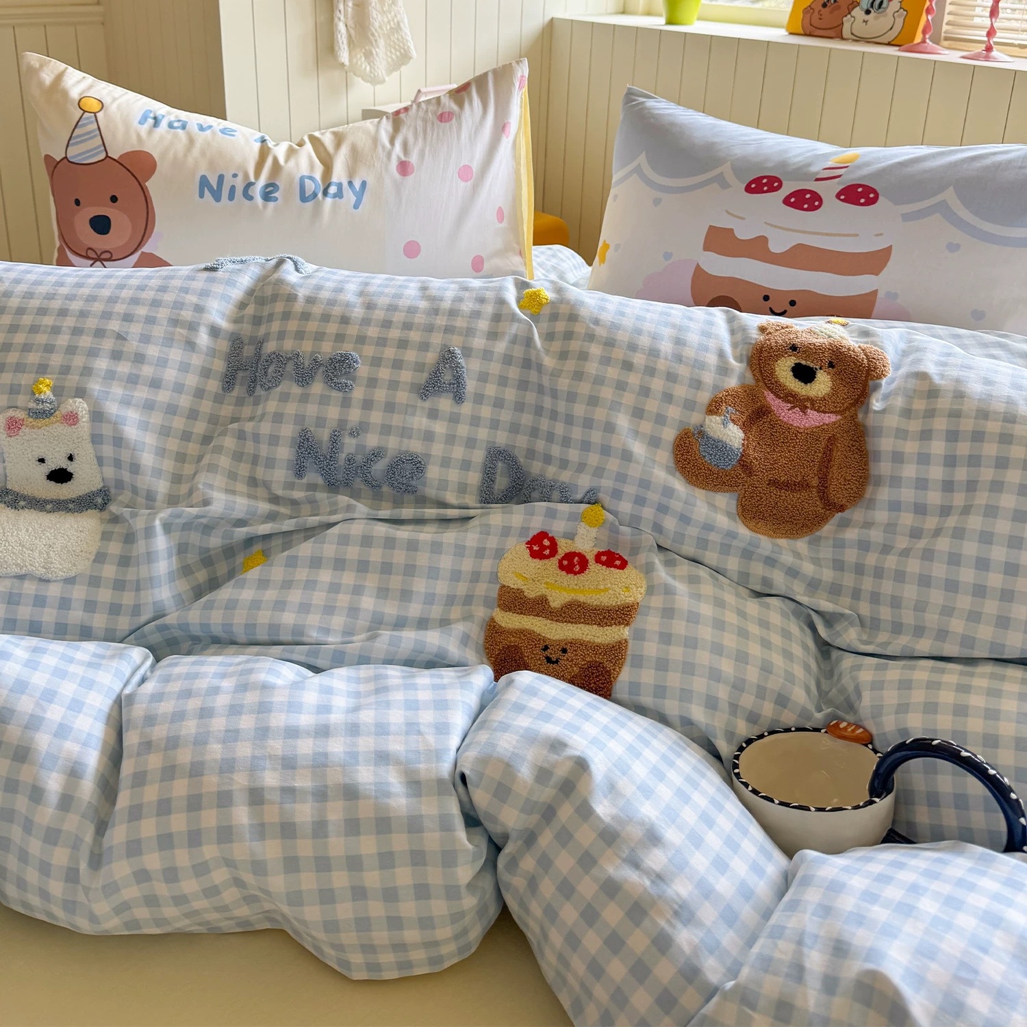 Ins風韓系純綿水洗い綿四点セットかわいいアニメ熊刺繍子供赤ちゃん小清新布団カバー