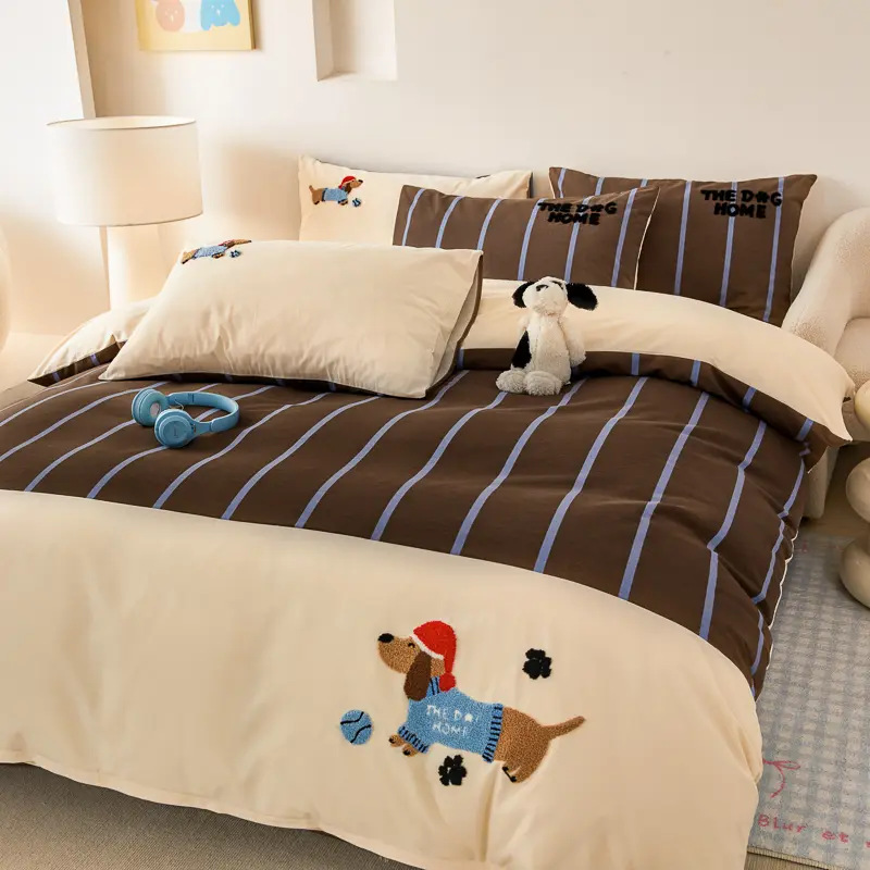 2024秋冬の新商品の全綿の厚い毛の4つのセットの大きい版の位置付けの印刷と刺繍の漫画の布団の寝具