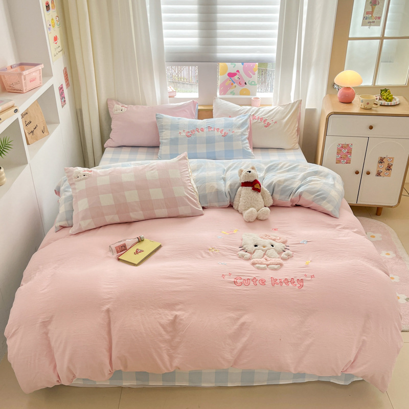 かわいいKT猫 ウォッシュドコットンベッド4点セット ウォッシュドコットン ガーリーハート 掛け布団カバー ベッド シングルドミトリー 3点セット