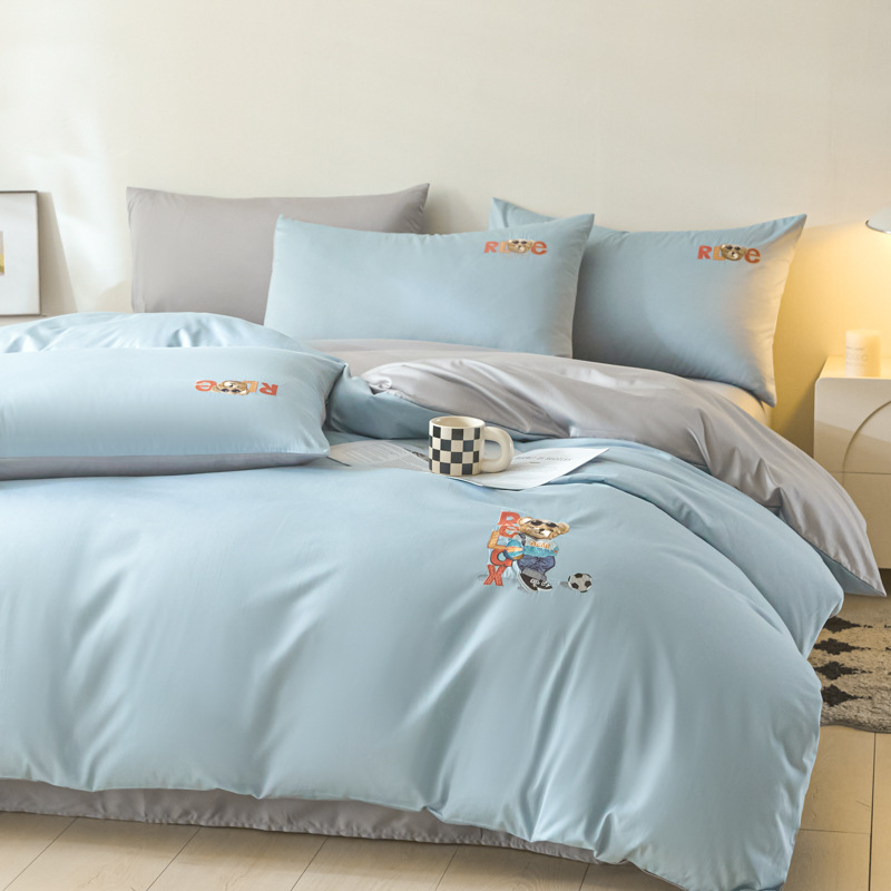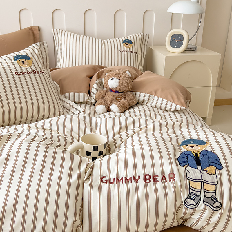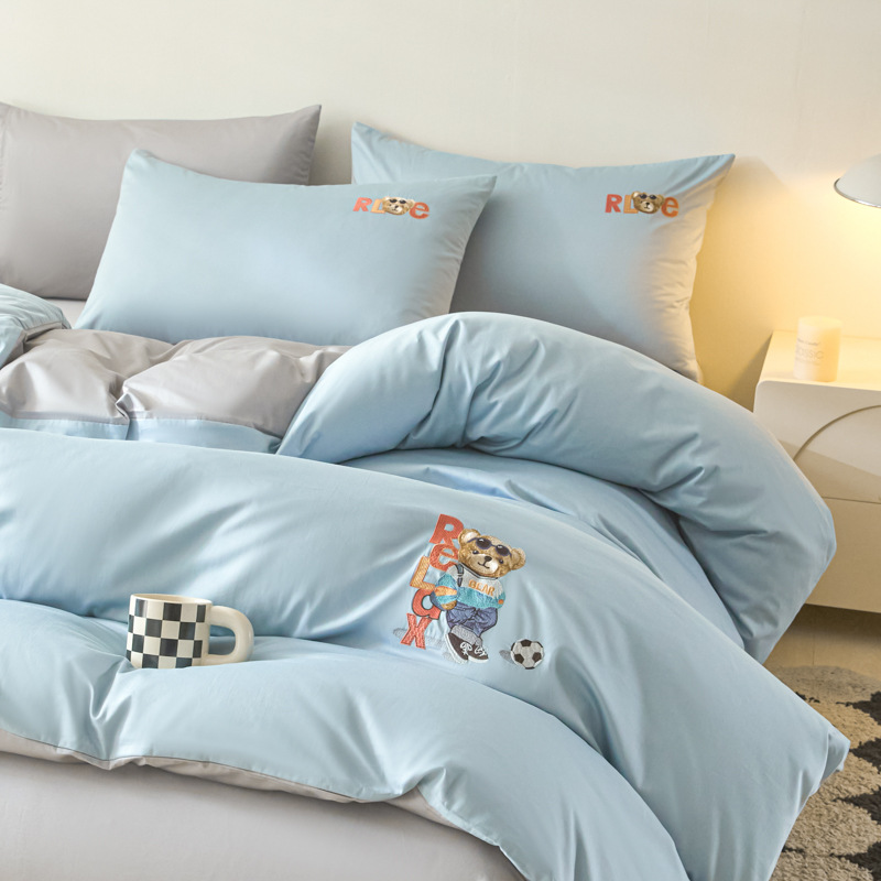 小清新四季長繊維綿100%4点セット、クマ刺繍入り純綿継ぎ合わせ掛け布団カバー、柔らかい寝具