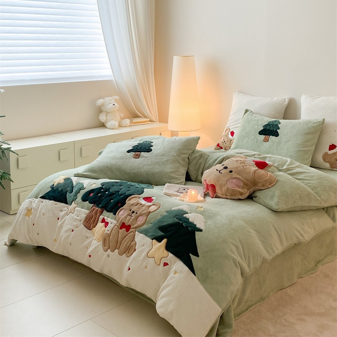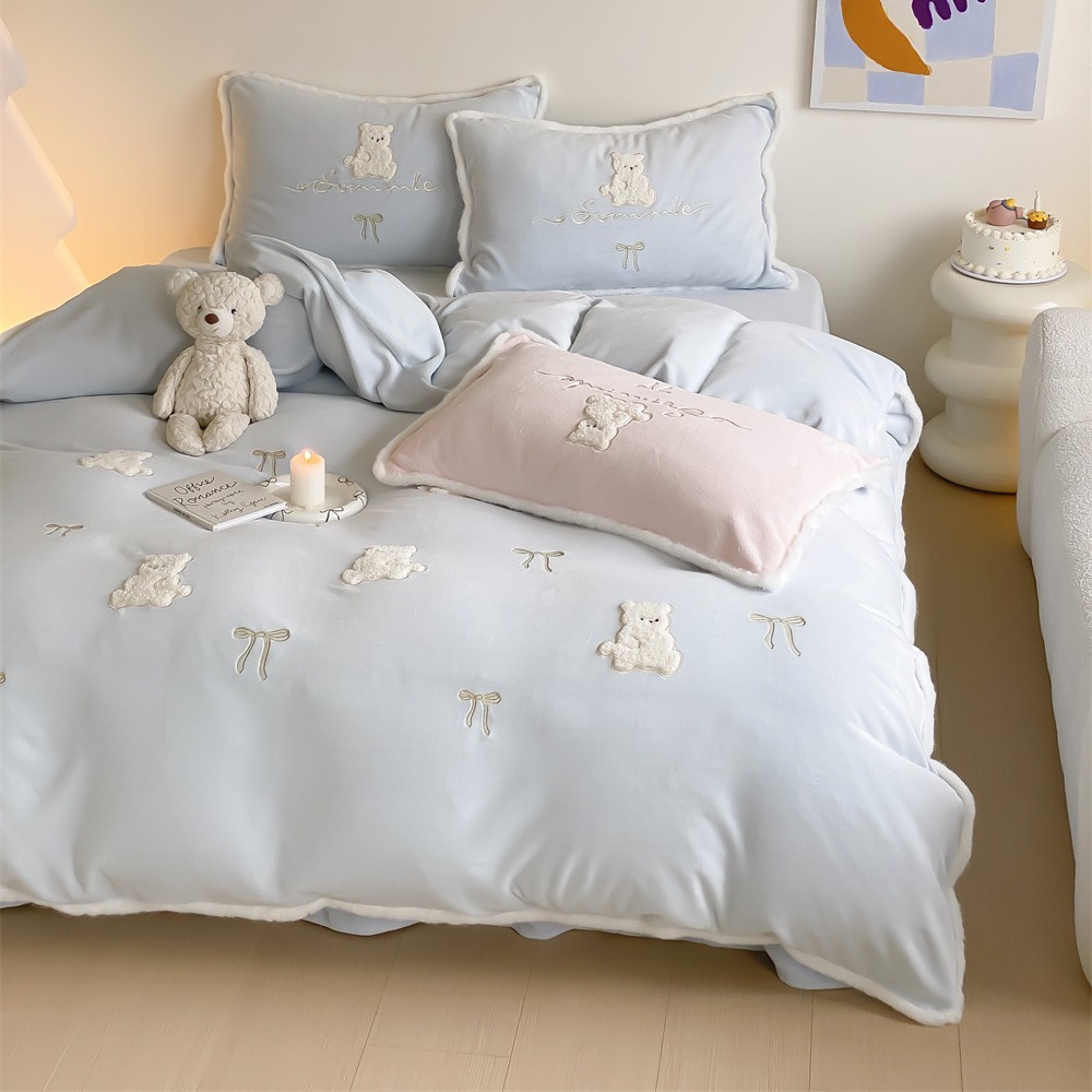 北欧の小清新新風熊刺繍寝具保温ベッド用品秋冬の厚いミルクの毛の4つのセットの家庭用紡績の森