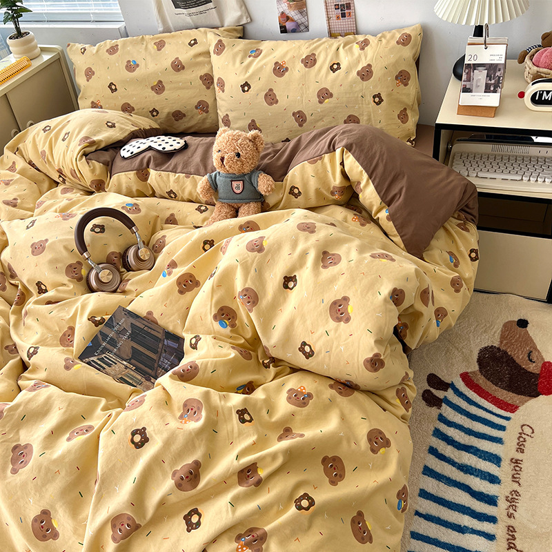 クラスA ウォッシュドコットン 4点セット 漫画クマ 寝具シーツ 掛け布団カバー ボックスシーツ 学生寮 3点セット 4
