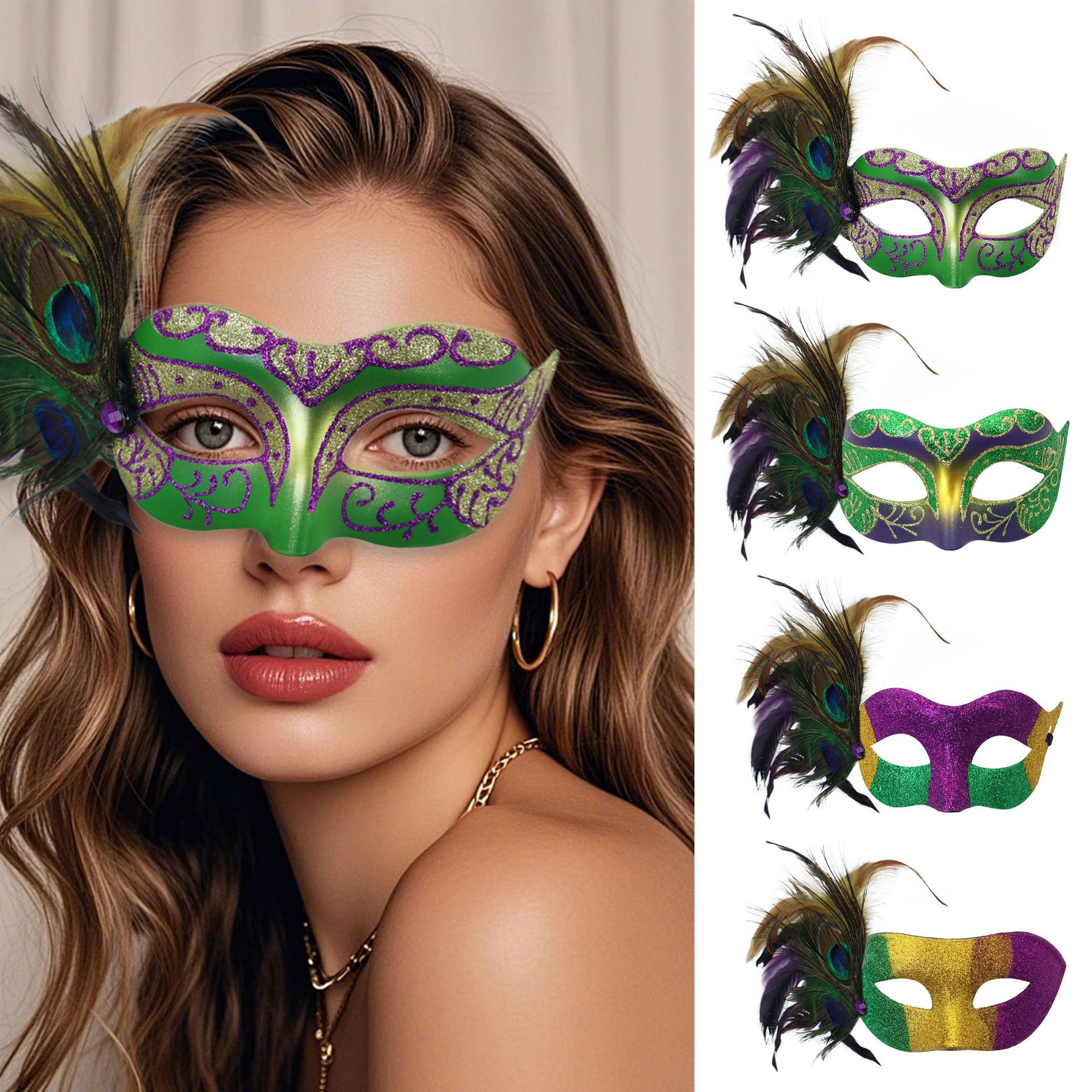 アマゾンの人気モデル紫金緑羽マスク女性王女カーニバルグラデーション化粧舞踏会半顔マスク