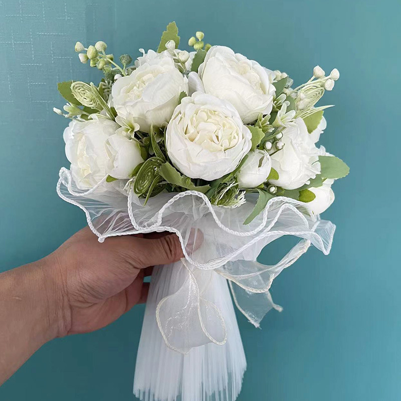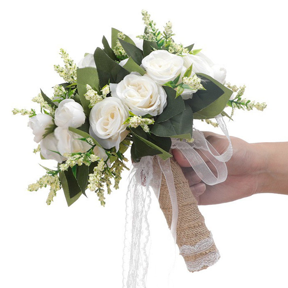 手に花を持つ花嫁の結婚式の花の白いシャンパンのシミュレーション花のバラの手に花を持つアマゾンの人気モデルのシミュレーション