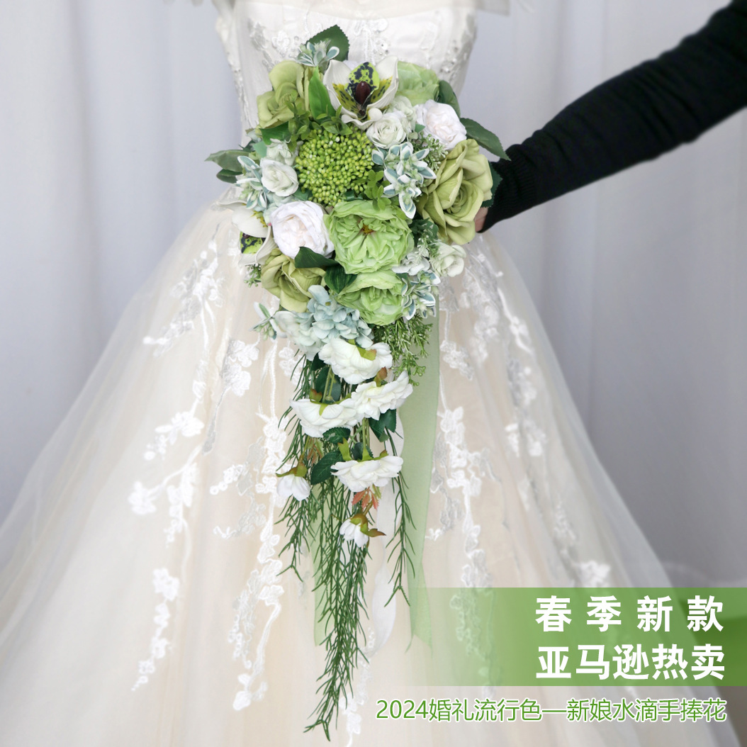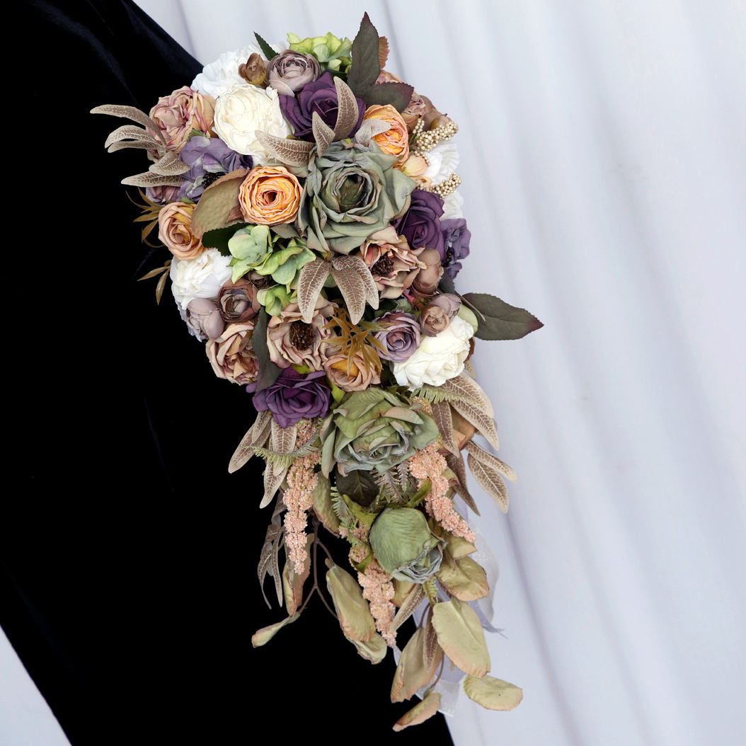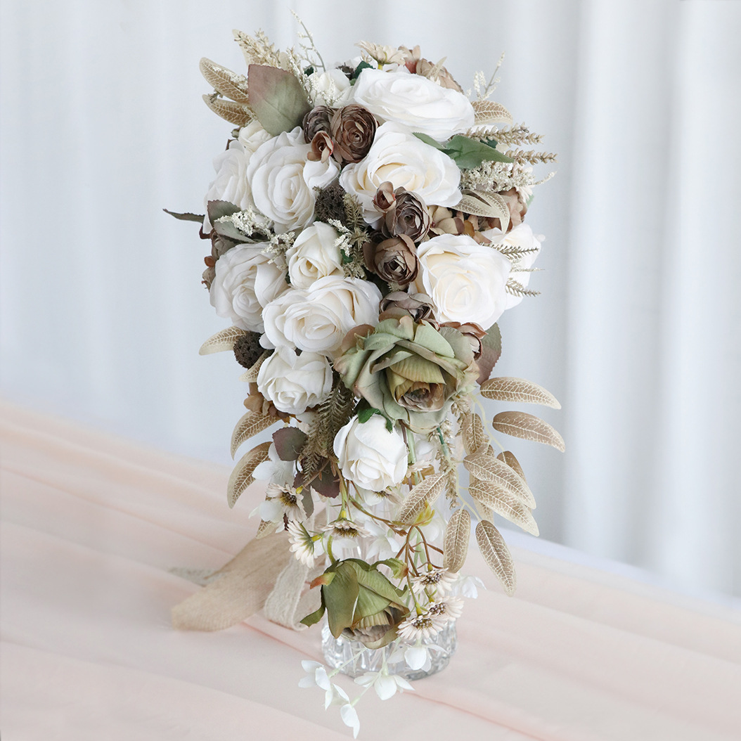 アマゾンは絹の花の花嫁の水滴の手で花の復古の結婚式の滝の手を持って花束の結婚祝いの写真を撮ります。