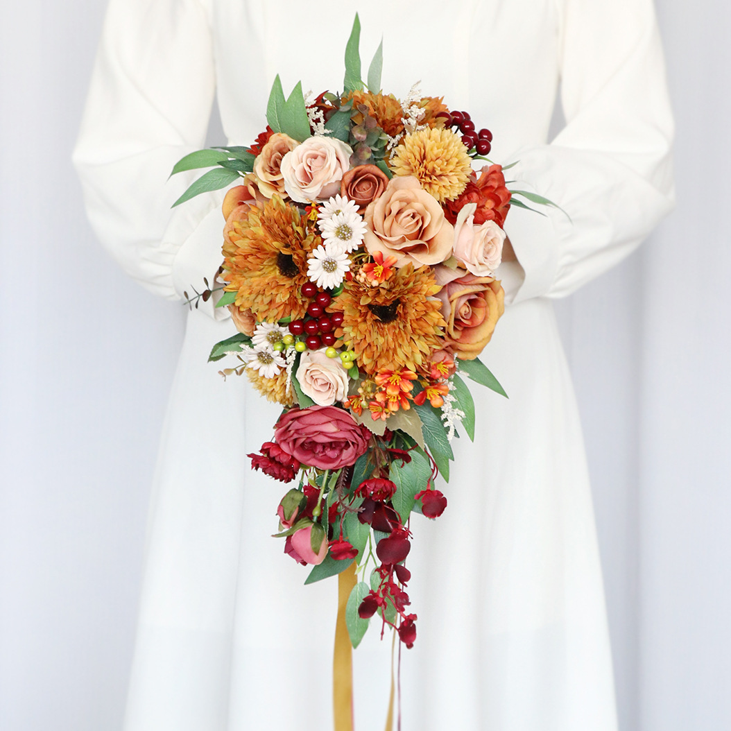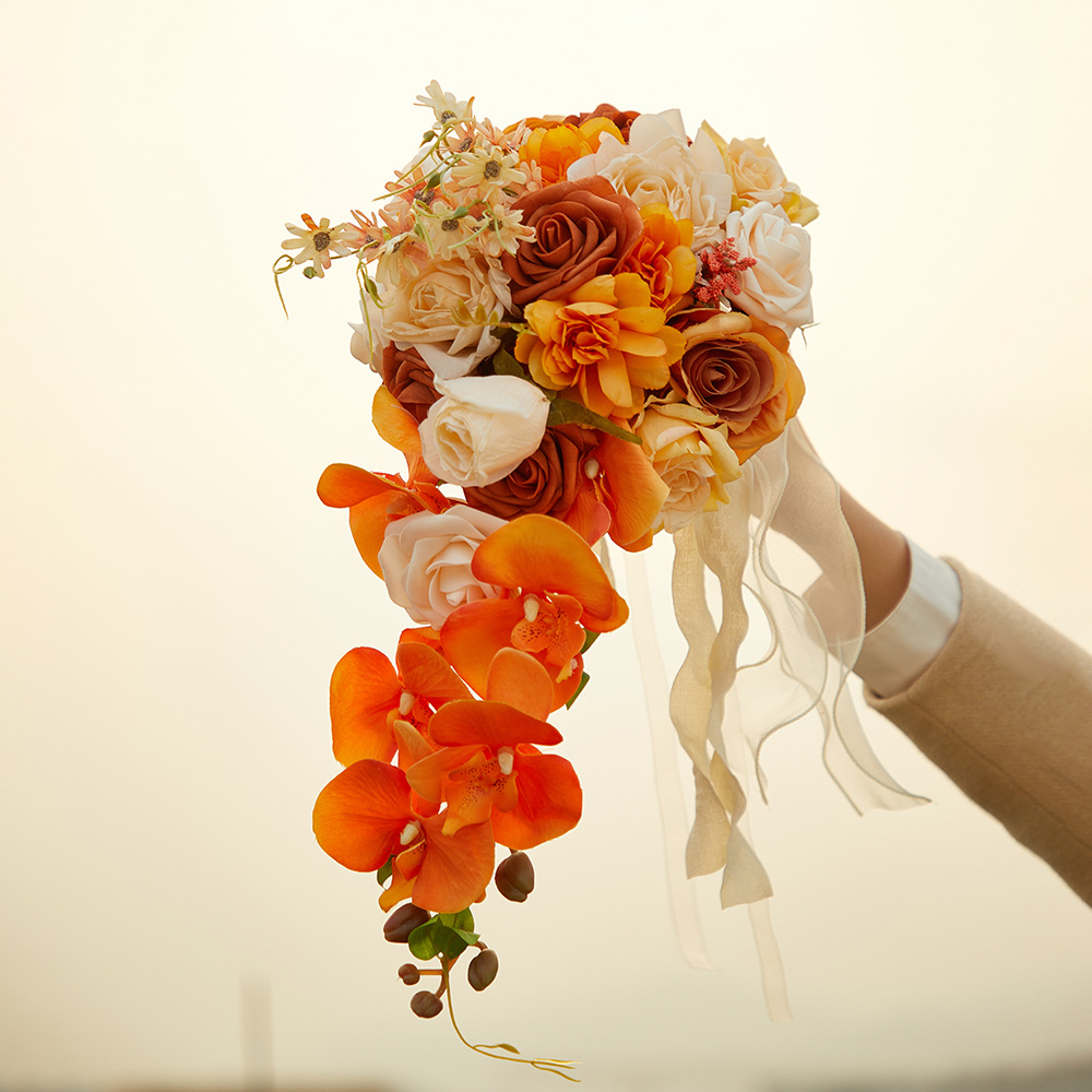 国境を越えた新商品の結婚式の花嫁の水滴の手は花の洋式の屋外の結婚の写真の道具の結婚式のシーンの配置の花を持ちます。