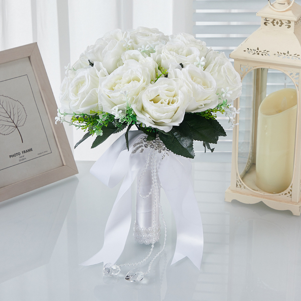 花嫁の手持ち花束、ダイヤモンドをあしらった造花のバラ、白いブーケ、結婚式の手持ち造花、越境で人気販売中