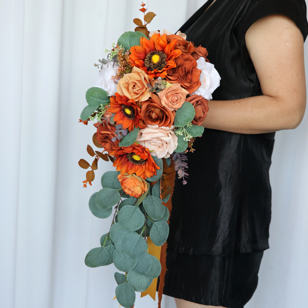 西洋風の屋外結婚式の花嫁の水滴ハンドブーケ模擬ひまわり結婚式の写真撮影手持ち花結婚式の偽の花束
