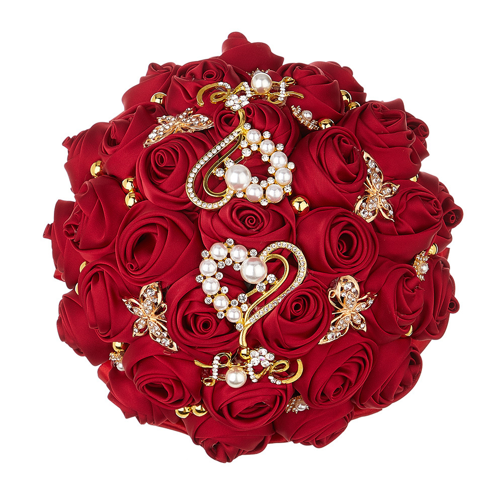 花嫁の赤いバラのブーケ、パール、ハート、ラインストーン、蝶、LOVEの花束、ウェディングブーケ、オリジナルデザイン