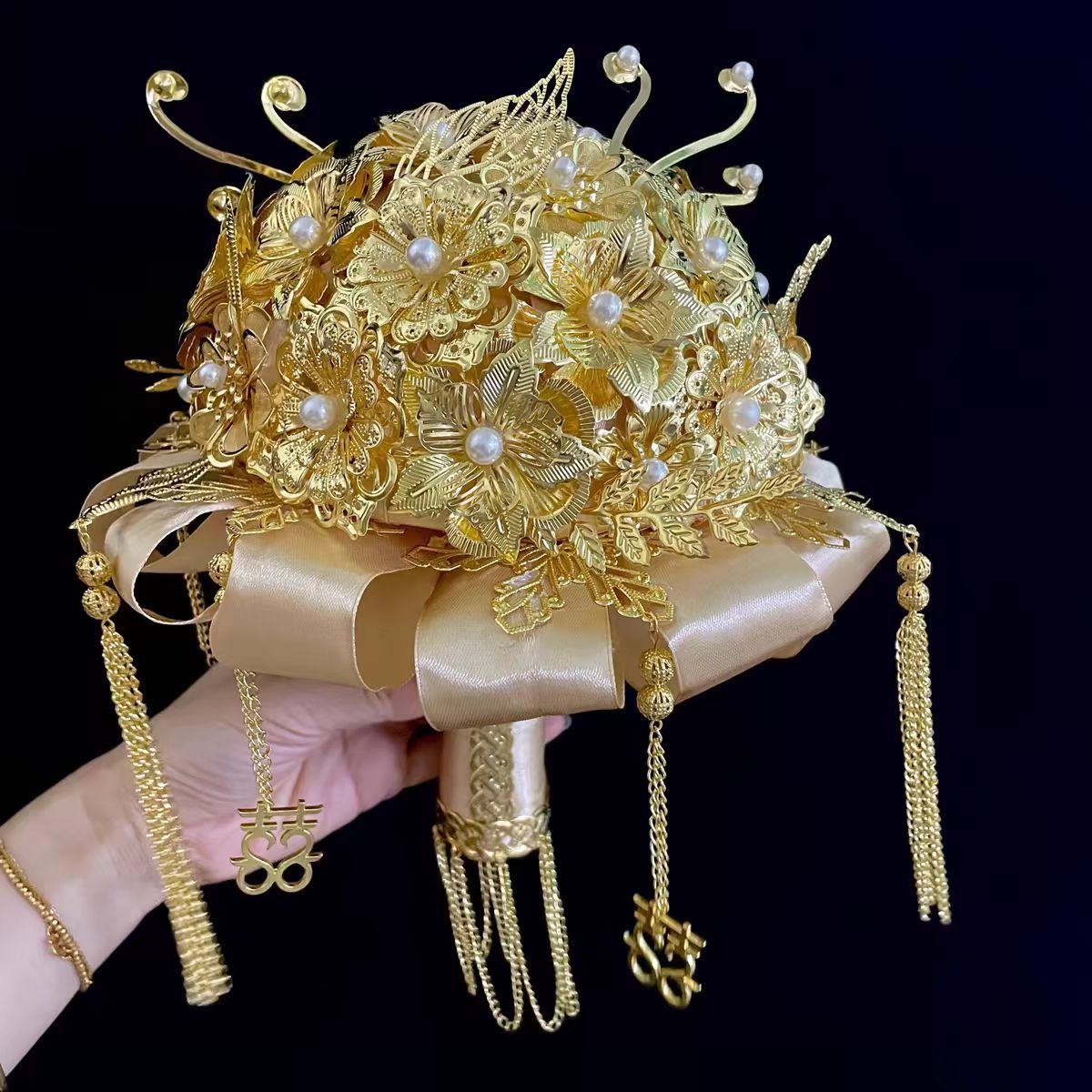 黄金色の手は花の花嫁の結婚の贈り物の結婚式のdiyの団扇の新婚の秀禾の親友の高級な手仕事の中国式を持ちます。