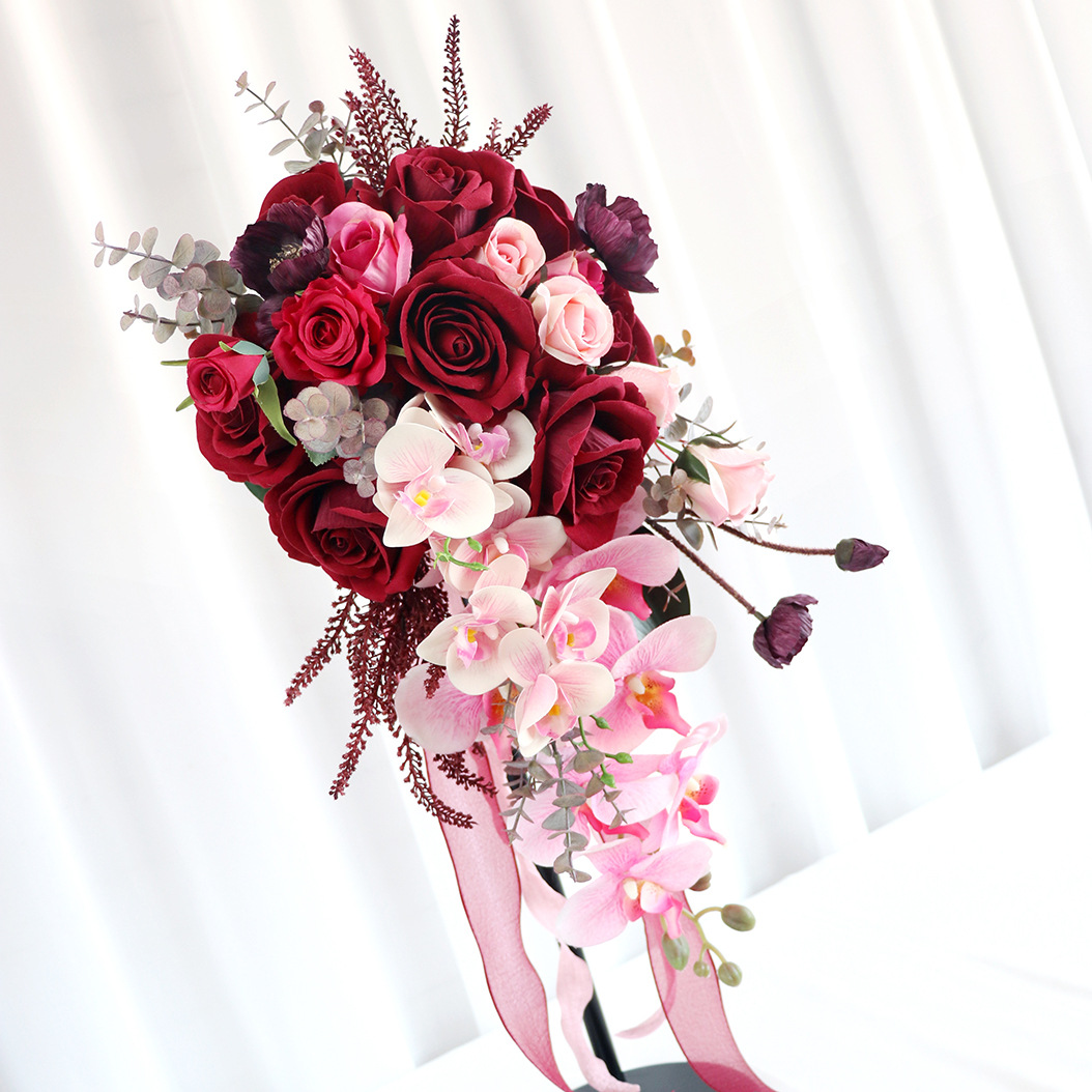 結婚式の花嫁のバラの花束のあん色のフランスの森系の高級感の滝の手の花の結婚の撮影のシミュレーションの花