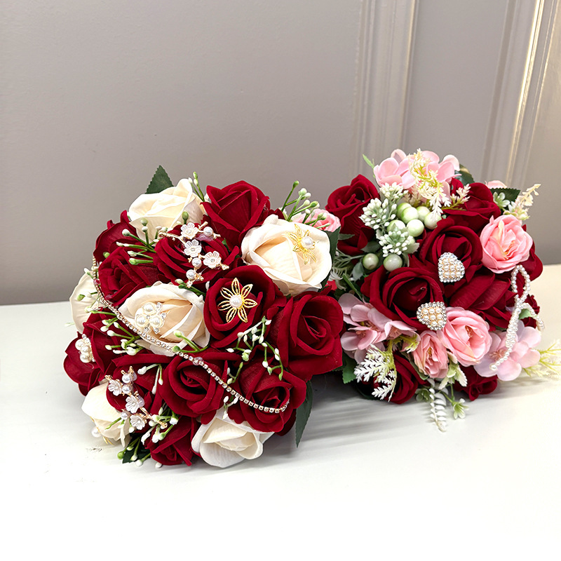 花嫁用造花バラのブーケ、人工撮影用ウェディング小道具、卸売、中国風和服用シルクフラワーブーケ