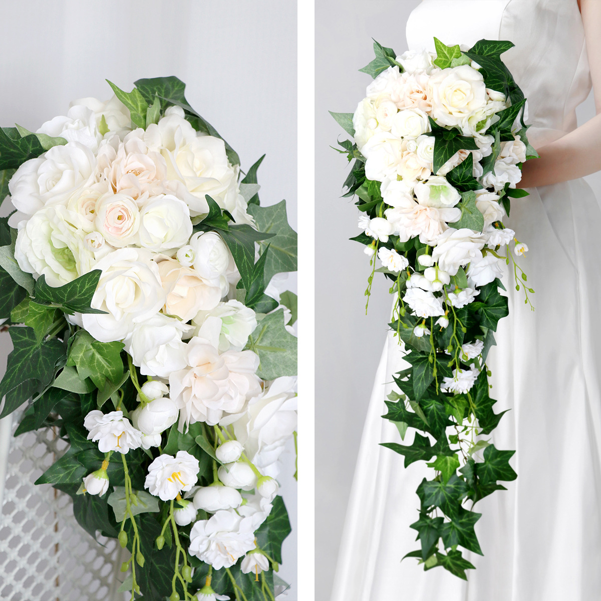 洋式の結婚式の新婦の水滴の手は花の滝の手を持って花束を持ってクロスボーダーの輸出の結婚のシーンの配置を持ちます。