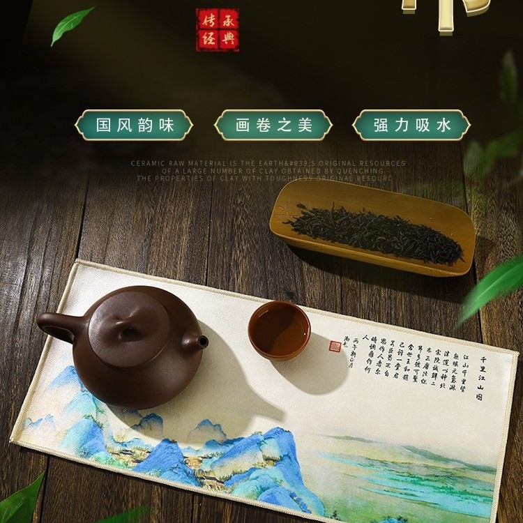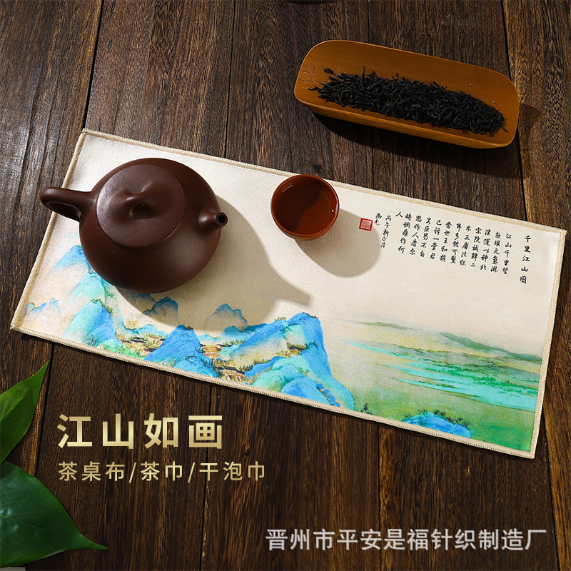 茶巾、テーブル、茶台、コースター、吸水性のある布、鹿革、絵画「千里江山」、茶芸、茶器、功夫茶