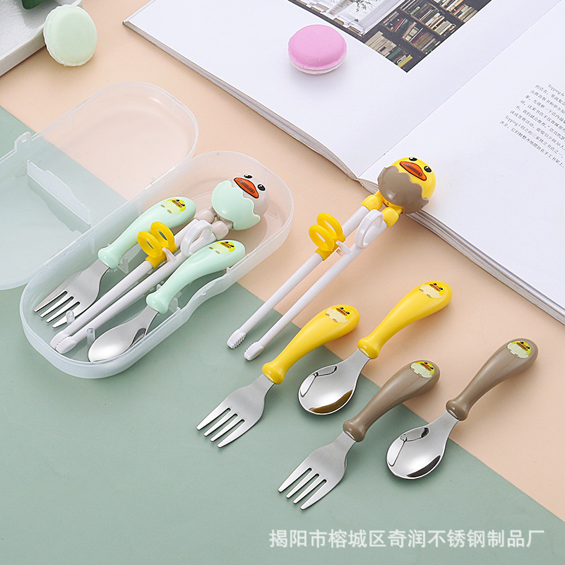 新型304ステンレス子供アニメ訓練箸赤ちゃんかわいい補助スプーンフォーク携帯三点セット