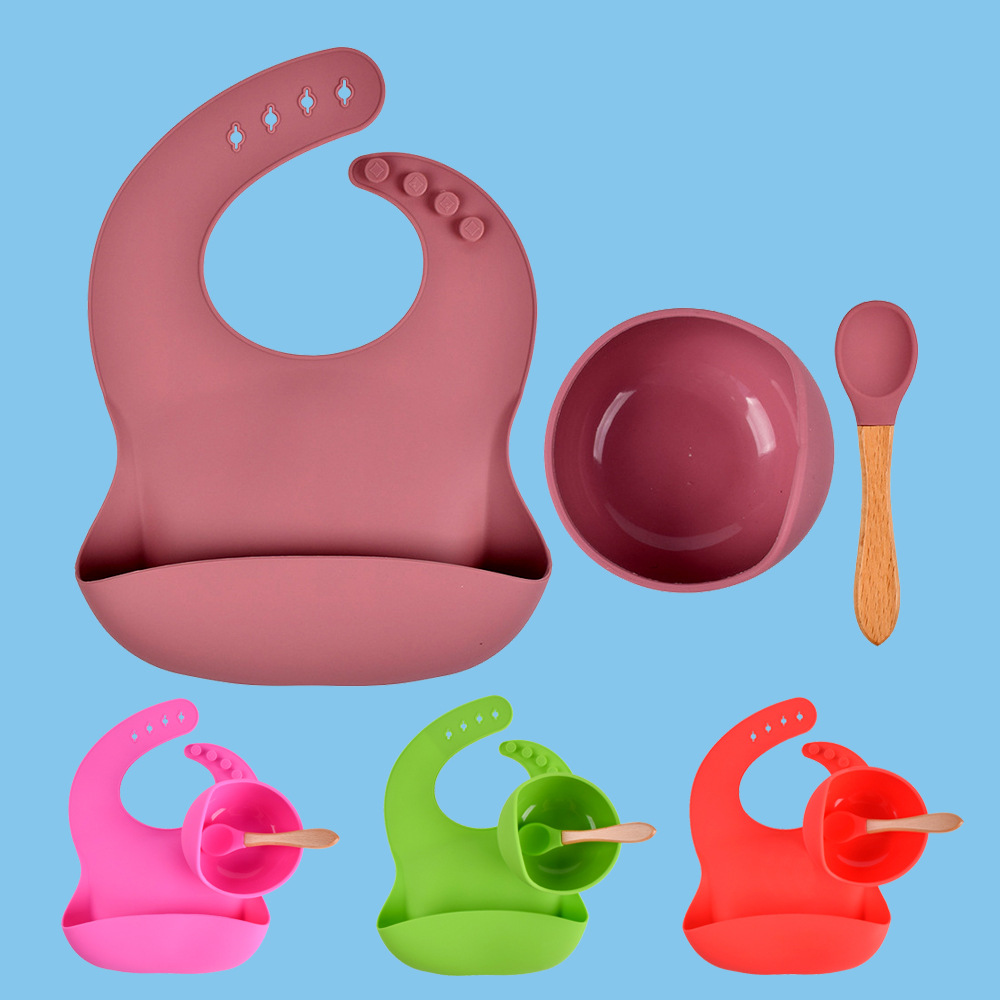 ベビー授乳食器シリコンよだれかけベビーボウルよだれかけシリコンボウル木柄スプーン三点セット工场卸売