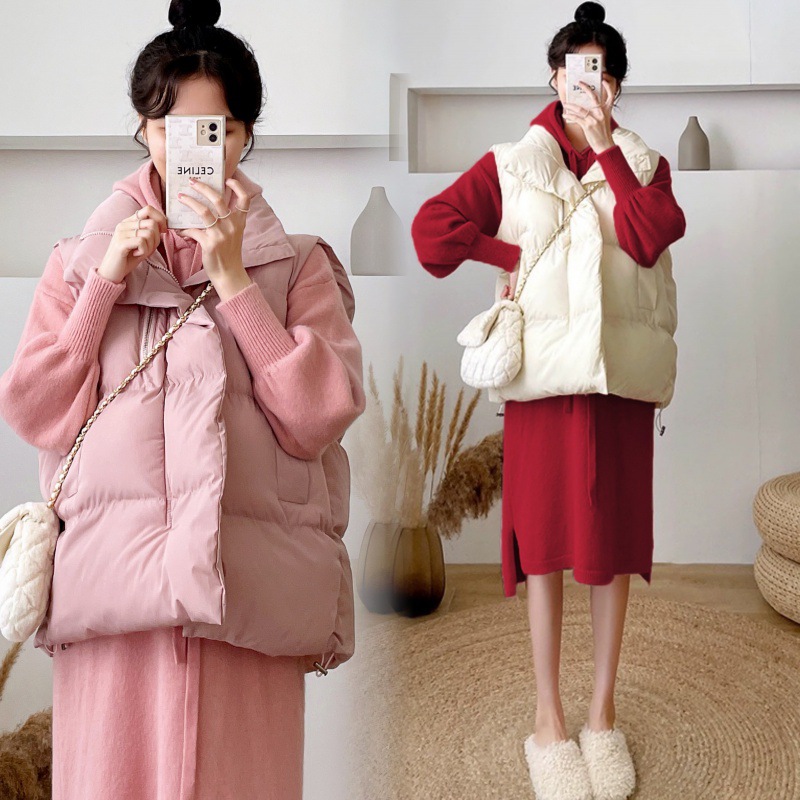 2025年秋冬新作 マタニティウェア ハーフタートルネックセーターワンピース+セーターベストロングスカート マタニティツーピースセット