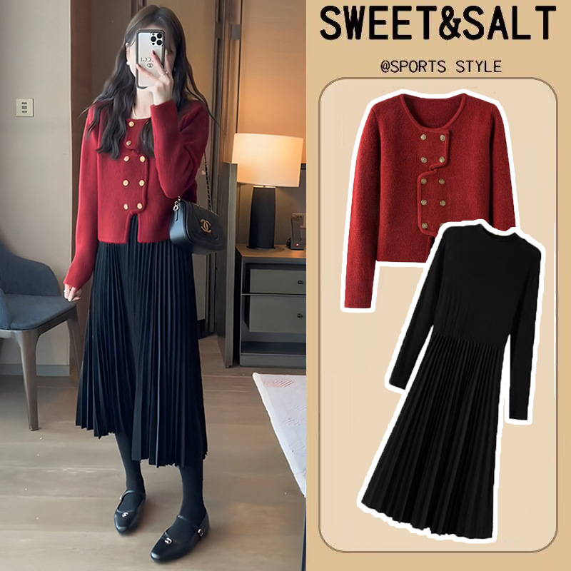 授乳服の外出秋冬セット赤いセーターのニットコートの底付きワンピース産後授乳セット